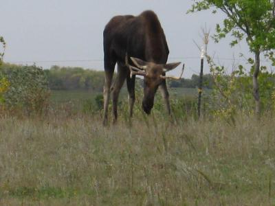 Ich hab einen Elch gesehen, die sind nur alle 10 Jahre hier in der Gegend, also hab ich Glueck gehabt. Er blieb 2 Tage lang in der Weide gegenueber der Farm und ist ziemlich riesig. Mit seinen langen Beinen kommt er problemlos ueber Zaeune hinweg.