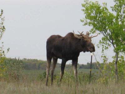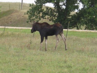 Ich hab einen Elch gesehen, die sind nur alle 10 Jahre hier in der Gegend, also hab ich Glueck gehabt. Er blieb 2 Tage lang in der Weide gegenueber der Farm und ist ziemlich riesig. Mit seinen langen Beinen kommt er problemlos ueber Zaeune hinweg.